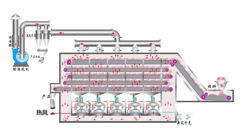 帶式干燥機(jī)主要由進(jìn)風(fēng)單元、排風(fēng)單元、循環(huán)風(fēng)單元、網(wǎng)帶、加熱系統(tǒng)、加料器、傳動機(jī)構(gòu)、控制系統(tǒng)等部件組成。物料由撒布機(jī)均勻地鋪在網(wǎng)帶上,網(wǎng)帶采用12-60目不銹鋼(或碳鋼)絲網(wǎng),由傳動裝置拖動在干燥機(jī)內(nèi)移動,干燥段由若干單元組成,熱空氣通過風(fēng)機(jī)穿過物料層,完成熱量與物料的交換過程,含水量較大的氣體由排風(fēng)機(jī)排出。